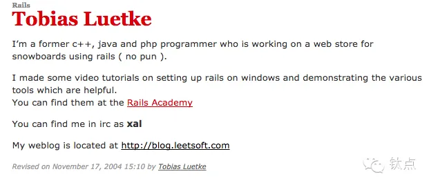 不过,身为一个对技术有着明显偏好的德国人,他为了在网上好好地卖滑雪板而去亲手开发用来搭建自己网店的软件,为了好好地开发软件而学了当时还不流行的Ruby语言,为了好好地利用Ruby而采用了不久前出现的Ruby on Rails框架,为了好好地使用Ruby on Rails而不断在开发者社区里分享自己用它开发那个做网店的软件的过程(这句话简直和他的行为逻辑一样拗口),并作为早期Rails开发者被社区熟知。