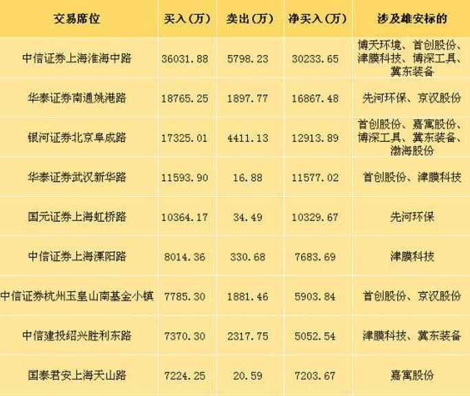 昨日,11只雄安登龙虎榜,根据公布的交易数据显示,首创股份狂力吸金,昨日前五主力买入该股的资金多达5.8亿元,先河环保获4.65亿元买入,津膜科技、东方能源、嘉寓股份、渤海股份、京汉股份、冀东装备、博天环境7股获逾亿元资金买入。建新股份、长青集团则分别获买入8530.01 万元、7023.06万元。