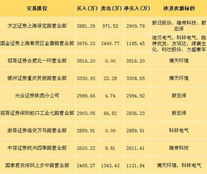 新宏泽、博天环境、雄帝科技均是近日较受瞩目的次新股,新宏泽和雄帝科技正畅享着送转填权,博天环境则置身雄安新区板块。新宏泽昨日的多方主力为兴业证券陕西分公司、招商证券深圳蛇口工业七路、方正证券上海保定路,三个席位买入额均超过两千万。雄帝科技的前三多方主力为中信证券杭州四季路、中信证券浙江分公司、中泰证券上海建国中路,此外,方正证券上海保定路昨日也入货雄帝科技1796.48万元。