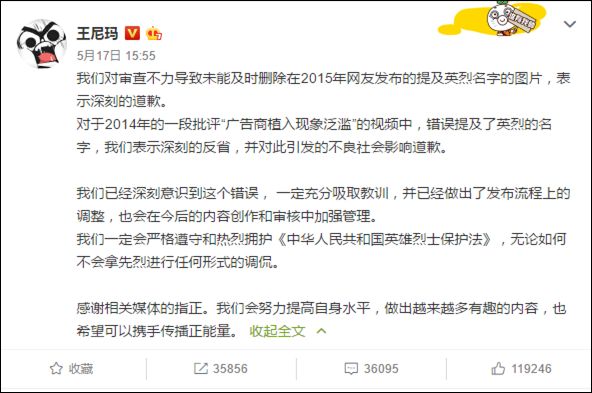 随后,王尼玛也在其个人微博写了道歉信向大众致歉。但其解释说这是节目中对于教科书植入广告的调侃,是一场误会。