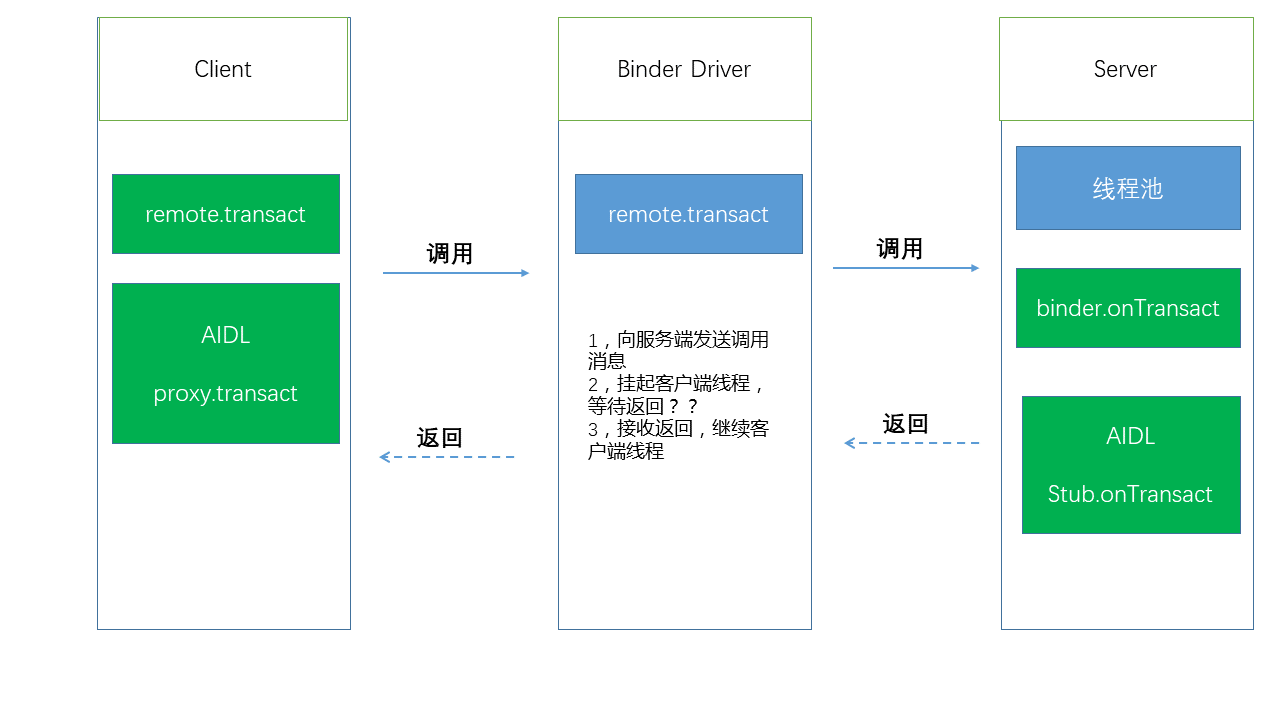 Client可以手动调用Binder Driver的transact接口,也可以通过AIDL生成的Proxy调用,Binder Driver会调用Server(service的代理,service中onBind返回的Binder对象);Server启动一个线程池来处理Client调用请求,处理完成后将结果返回给Binder Driver,Binder Driver再返回给Client。